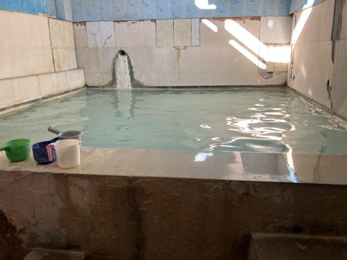 Mannen en vrouwen baden naakt en apart. Eric past, het water is hem te heet. Ik ga naar het vrouwenbad en ben een beetje teleurgesteld als ik het overdekte badhok zie. Het ruikt naar zwavel. Het grote openlucht bad – een miniversie van Pamukkale in Turkije – is vandaag alleen geopend voor mannen. De vrouwen mogen morgen. Ik maak toch maar een plons in het warme water, want na twee dagen met de ramen open over gravelwegen rijden, begin ik aardig te verstoffen. Mijn haar voelt als touw en mijn voeten als schuurpapier. De zwarte eeltranden langs mijn hielen krijg ik mogelijk nooit meer schoon.