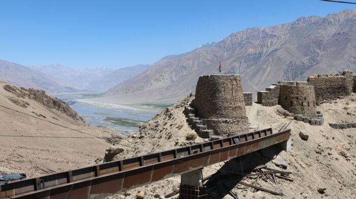 Na de bergpas zien we Afghanistan aan de overkant van de bruine kolkende Panj-rivier. We rijden kilometers langs de rivier die de grens tussen beide landen vormt. Waanzinnig hoge en steile bergen flankeren beide kanten. Overal patrouilleren jonge soldaten in groepjes van drie met Kalasjnikovs. De grens wordt bewaakt door militairen die verder vriendelijk lijken en om sigaretten vragen als je passeert.